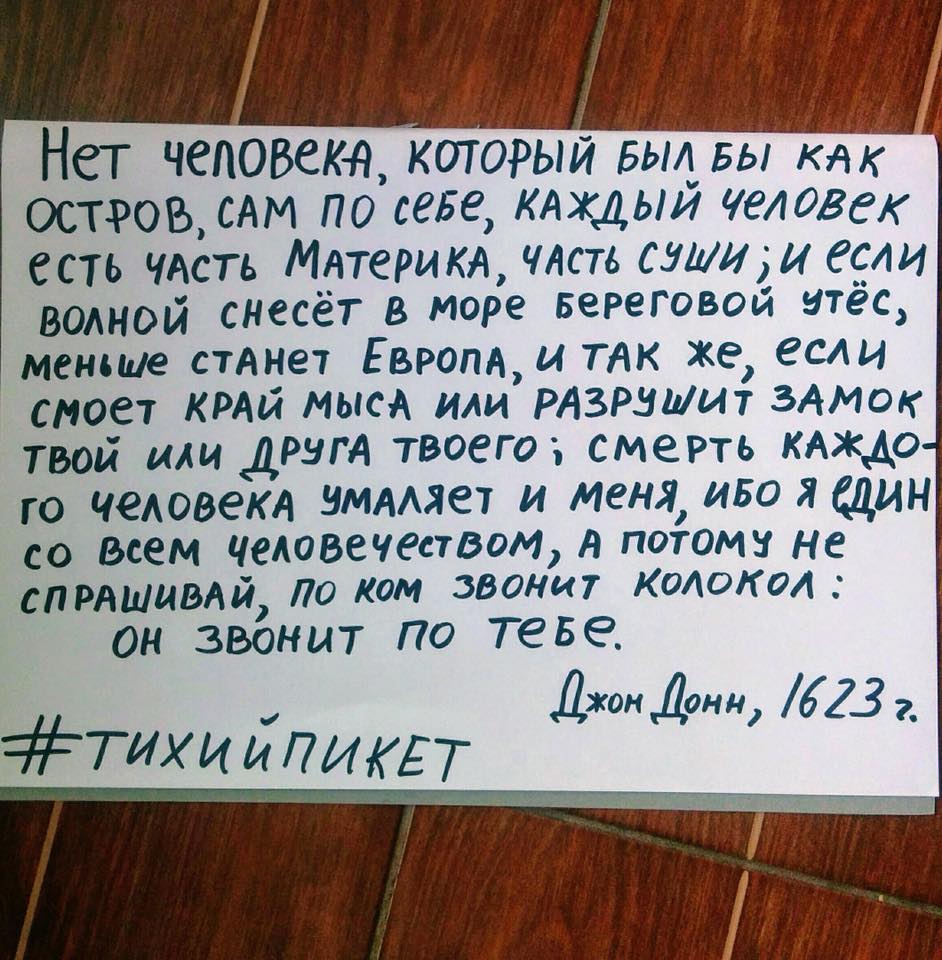 Так совпало, что двухлетие тихогопикета — это траур по погибшим при пожаре в торговом центре в Кемерово. Всю эту неделю я буду ездить только с этим плакатом, со стихотворением Джона Донна.
