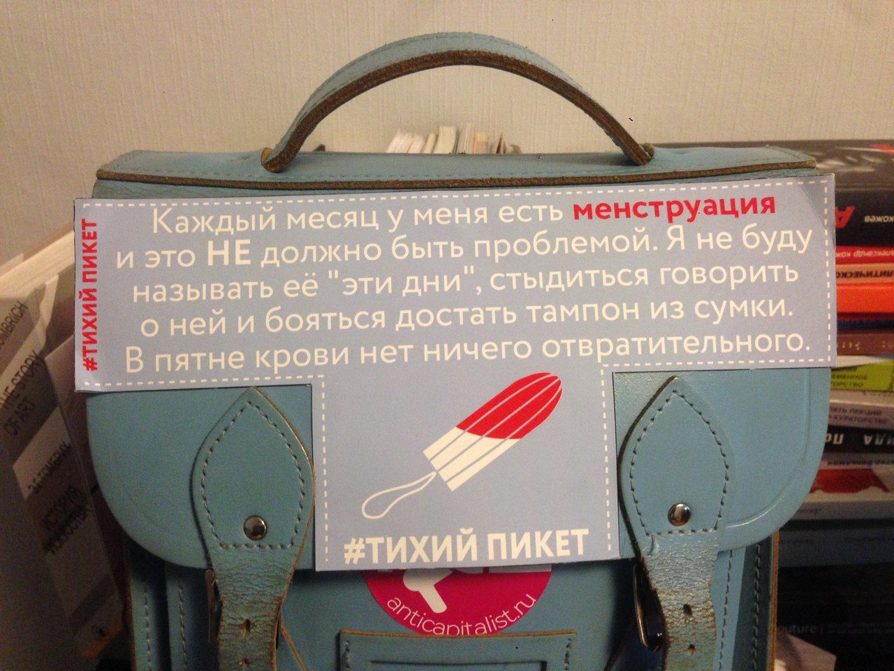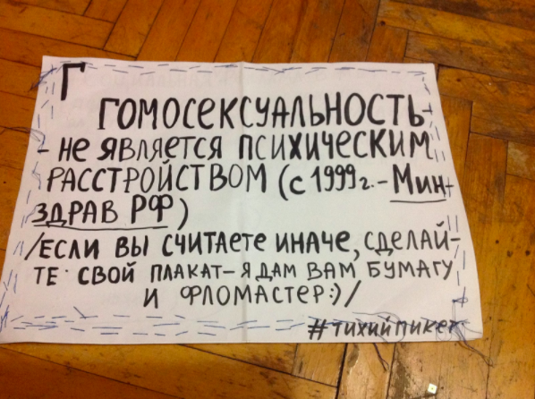 28 марта акции #тихийпикет исполняется два года. Все это время активисты и активистки передвигались с плакатами в опущенных руках или плакатами, пришитыми к рюкзакам. Смысл акции заключается в том, чтобы инициировать безопасную коммуникацию на тему плаката. Тихопикетирующие молчат до тех пор, пока к ним не обратится незнакомый человек, прочитавший плакат.