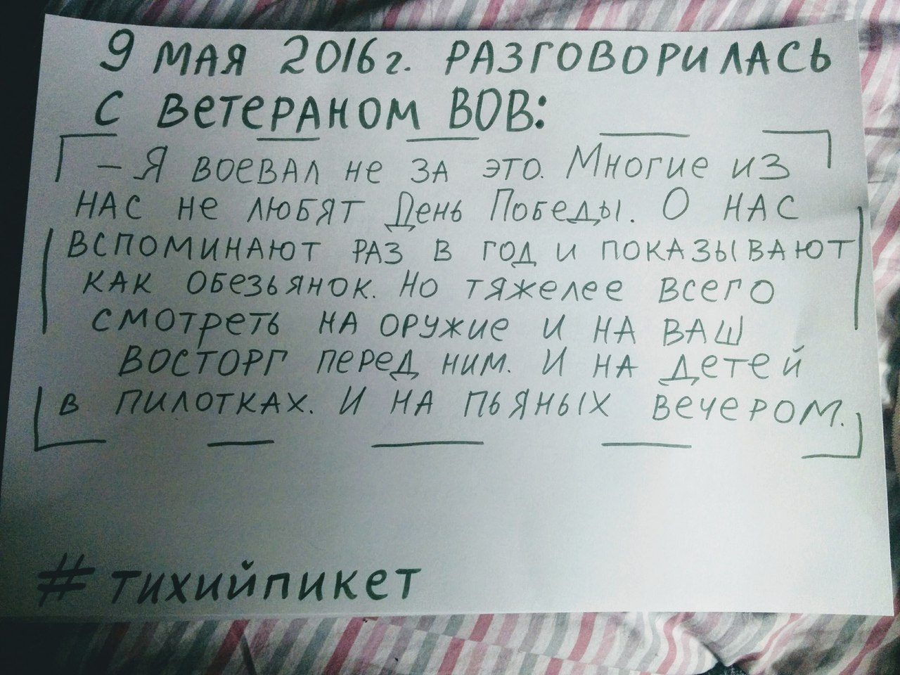 Два года подряд езжу на 9 мая с плакатами акции. Текст плаката 2017 года основан на реальной истории: «9 мая 2016 г. разговорилась с ветераном ВОВ: «Я воевал не за это. Многие из нас не любят День Победы. О нас вспоминают раз в год и показывают как обезьянок. Но тяжелее всего смотреть на оружие и на ваш восторг перед ним. И на детей в пилотках. И на пьяных вечером». Реакции в оба года были в основном негативные и от людей средних лет. Не все из них были трезвыми. Мне говорили, что я не люблю свою страну и что мне заплатили за плакат. В соцсетях многие не верили в то, что ветеран мог такое сказать.
