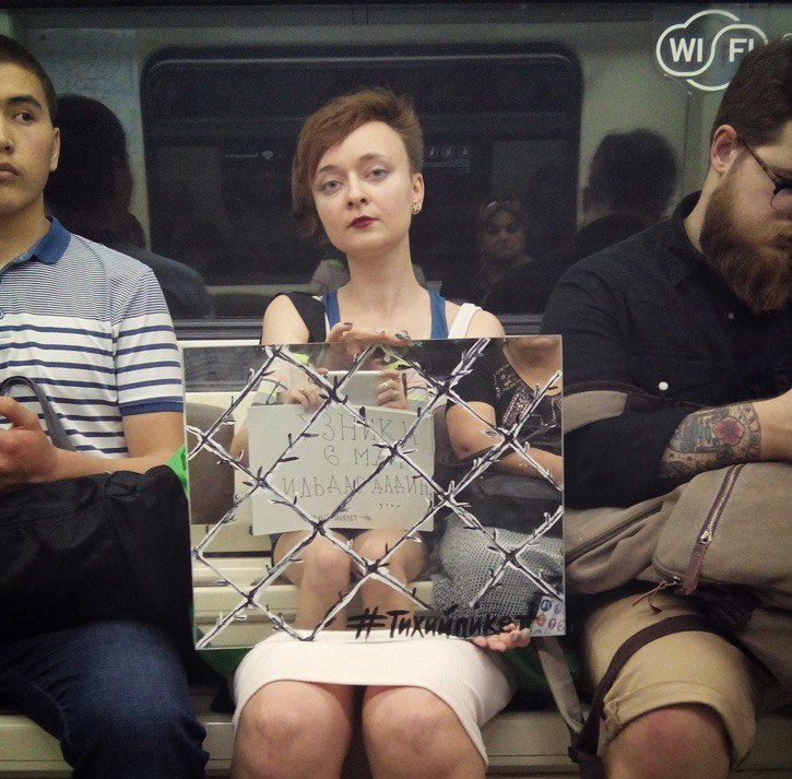 Перформативный плакат-зеркало про политических заключенных. Мы делали его вдвоем. У меня в руках было зеркало формата А3, поверх зеркала была нарисована колючая проволока и написан хэштег #тихийпикет. У другой девушки в руках был листок А3 с написанным зеркальным шрифтом именами политзаключенных. В вагоне мы сидели напротив друг друга. Таким образом, в моем зеркале можно было прочитать имена, виднеющиеся из-под колючек.