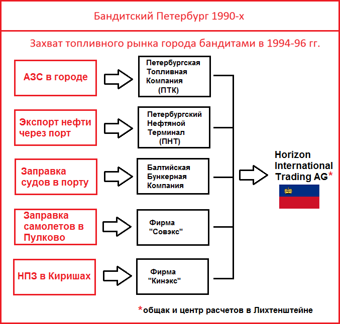 Или приватизация топливных активов в Петербурге в 1990-е. Это же гангстерский сериал был. С тамбовской ОПГ Петербурга в главной роли, и с участием Путина тоже. На Радио Свобода в свое время была целая серия публикаций про фирму “Совэкс”. В 1996 году ей отдали заправочный комплекс для самолетов в Пулково (распоряжением Путина). Эта же фирма участвовала и в создании Петербургского нефтяного терминала (ПНТ) в 1995 году. Это канал вывоза нефтепродуктов через порт Петербурга. Это все лакомые куски, очень доходные места.