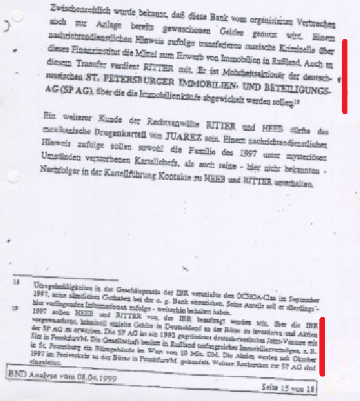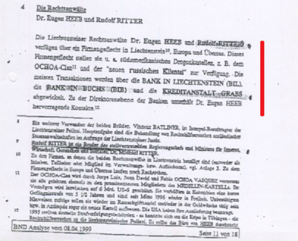 Они там обнаружили у себя международную сеть отмывателей денег, которая охватывала Германию, Швейцарию, Россию и еще ряд стран. Центр был в Лихтенштейне. Всем заправляла группа местных адвокатов. По этому поводу был подготовлен специальный доклад БНД от 8 апреля 1999 года для руководства Германии. Сначала он был секретный, но позднее для целей давления на власти Лихтенштейна (которые покрывали эту малину) с ним познакомили прессу. “Шпигель” про него написал и другие издания.