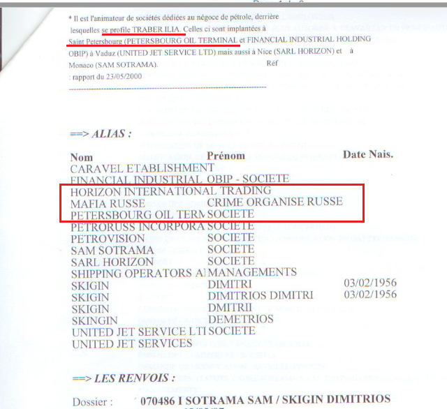 Фрагмент полицейского досье Монако на Скигина. Указано, что Скигин работает с Трабером, что Петербургский нефтяной терминал – это “русская мафия”, и офшор “Горизонт” – тоже.