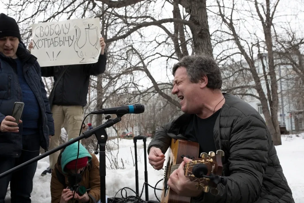 Пустой сквер на Серпуховке. Лужи, голые деревья, черный, уже начавший таять снег. Через пять минут здесь начнется концерт Леонида Федорова в поддержку историка Юрия Дмитриева, которому грозит девять лет. Приговор — послезавтра.