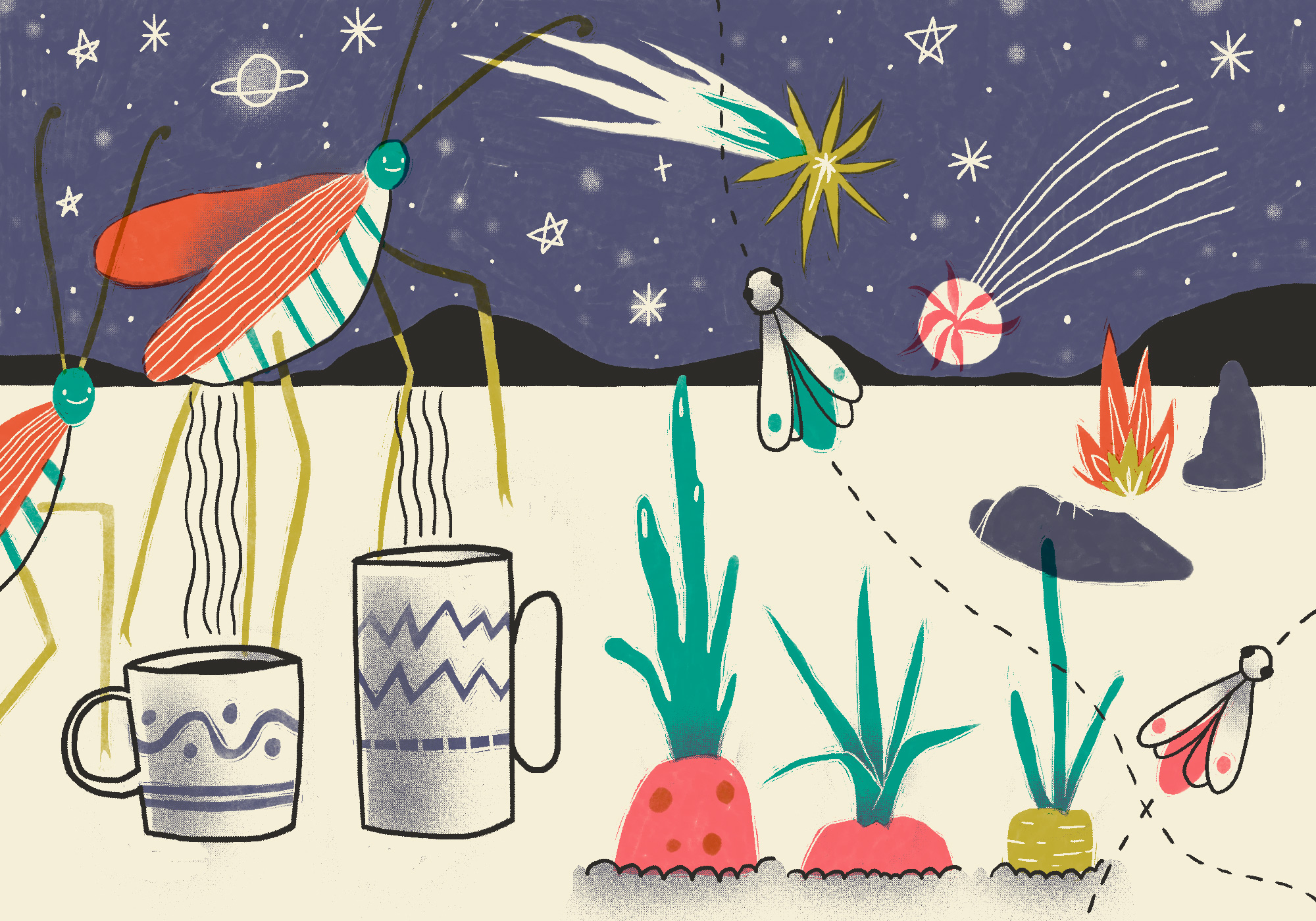 Здесь я, кажется, впервые увидела звездопад: как будто окурки бросают из космоса, иногда теплые желтые, иногда холодного света белые, иногда бросают как будто снизу вверх — и оказалось, что стоит завести про запас еще хотя бы десяток заветных желаний.