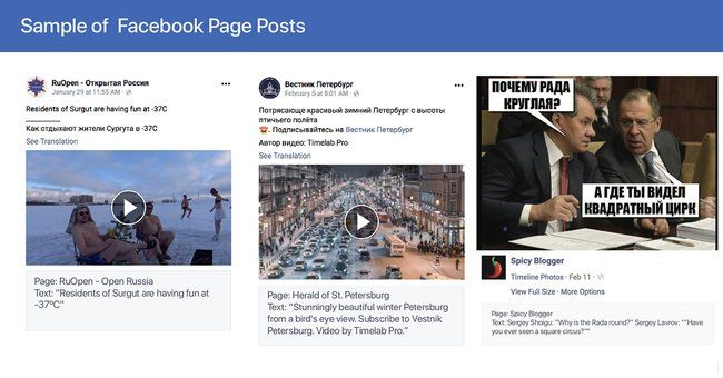Facebook has offered a few examples of what the “troll factory” was sharing on its network. The content ranges from overt political memes to anodyne photographs of life in Russian cities and stories about ordinary Russians. The list of deleted pages includes “Spicy Blogger,” “Politiach,” “RuOpen — Open Russia,” “Elitism,” “The Petersburg Herald,” “The Moscow Herald,” “The Nizhny Novgorod Herald,” “The Krasnoyarsk Herald,” “Elections 2018,” “Tourism in Russia,” “World Politics,” and others. All these pages have now been removed from Facebook.