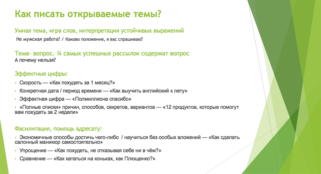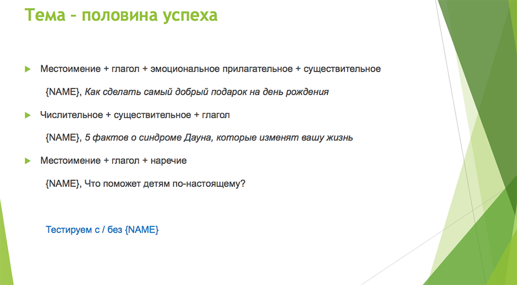 «По нашему опыту тема письма дает 60-70% процентов успеха рассылки, а точнее повышает вероятность того, что ваше письмо откроют. Также обращайте внимание на первое предложение, которое отображается в браузере. От того, как вы напишете имя отправителя и тему письма, зависит, откроют письмо или нет. В отправителях можно написать ваше имя, фамилию или название организации». Полина Кружкова