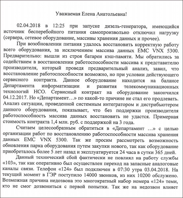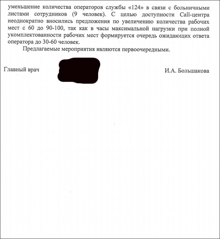 В распоряжении редакции оказалась копия письма главврача новосибирского ГБУ «Станция скорой медицинской помощи» Ирины Большаковой по поводу сбоя в работе call-центра для записи на прием и в работе онлайн-регистратуры. Документ адресован замминистру здравоохранения Елене Аксеновой.