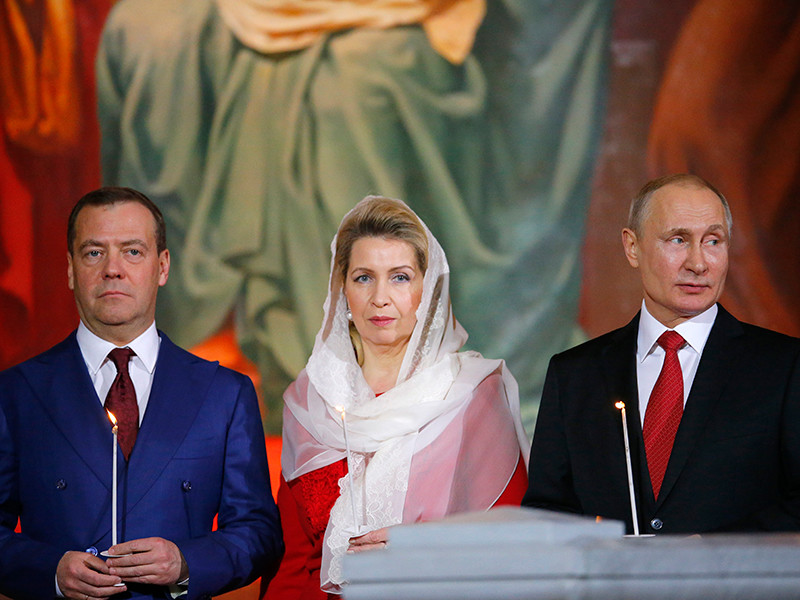 Президент России Владимир Путин и премьер-министр Дмитрий Медведев с супругой приняли участие в пасхальном богослужении в храме Христа Спасителя, которое совершил Патриарх Московский и всея Руси Кирилл, передает ТАСС.