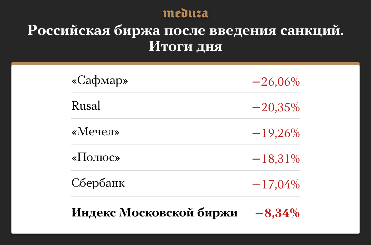 Дата09.04.2018АвторСкрытИсточникМедузаСохранённая копияInternet ArchiveOriginal MaterialShow translationОбвал на российском фондовом рынке из-за американских санкций. В одной картинкеУчитывались только акции, входящие в базу расчета индекса Московской биржи. О других последствиях санкций читайте тут. Фото в анонсе: Александр Кряжев / Sputnik / Scanpix / LETA