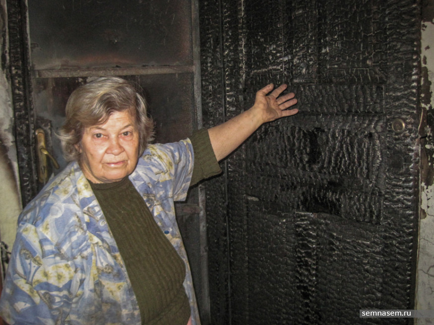 Сильнее всего пострадала квартира №159, где живет пенсионерка Галина Кожанова. Стена, разделяющая квартиру и коридор, и деревянная входная дверь обуглились, металлическая погнулась. Пенсионерка почти полтора месяца жила в квартире с обугленными дверями, держащимися на веревочке, пока управляющая компания «Жилсервис» не поставила новые.