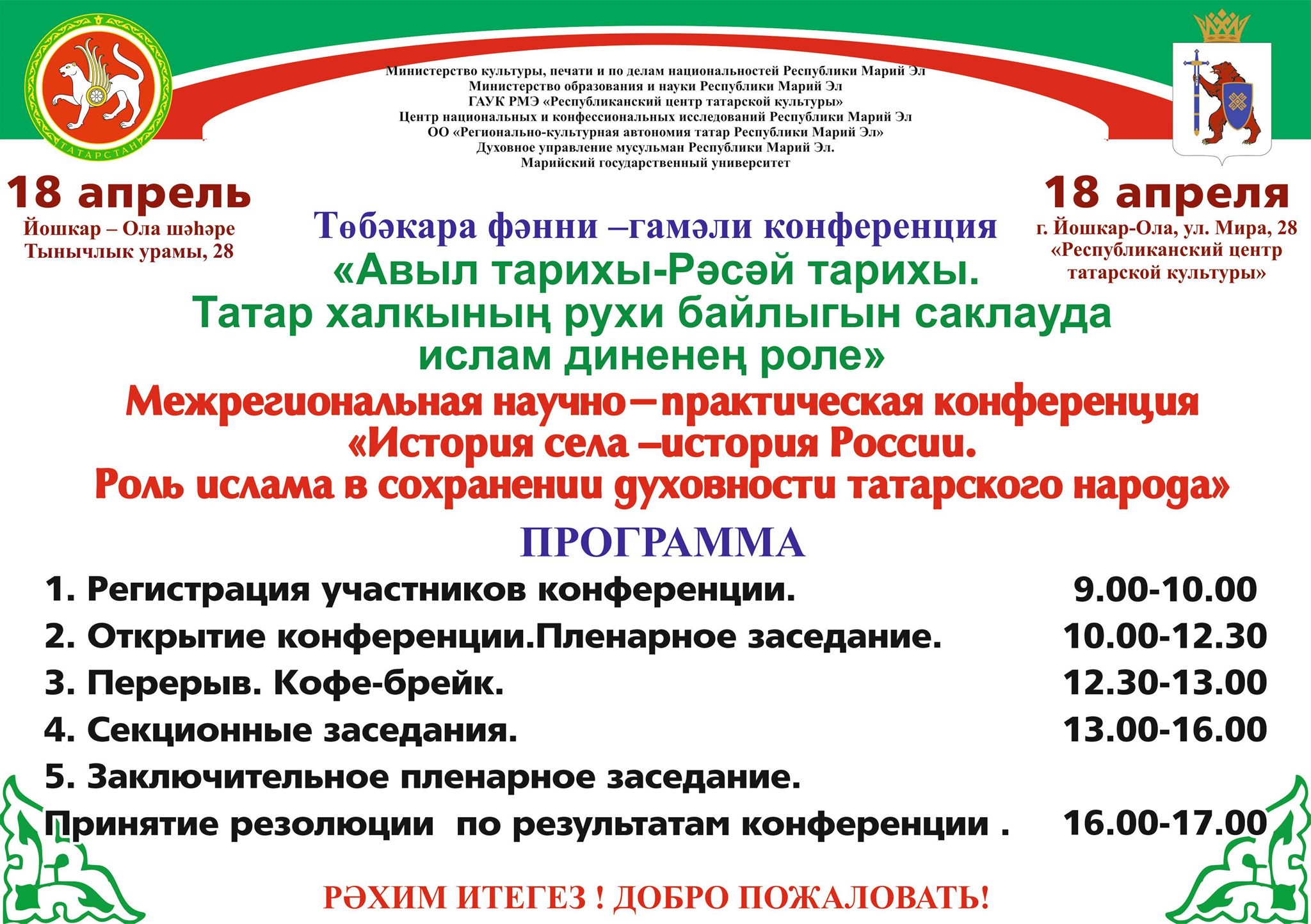 Всех желающих принять участие в работе конференции и докладчиков ждём 18 апреля 2018 года в Концертном зале «Республиканского центра татарской культуры» по адресу: г.Йошкар-Ола, ул.Мира, д.28.