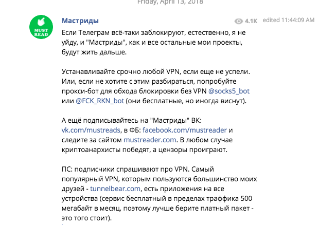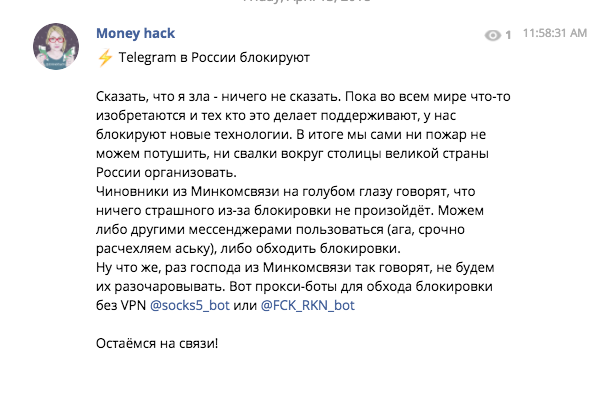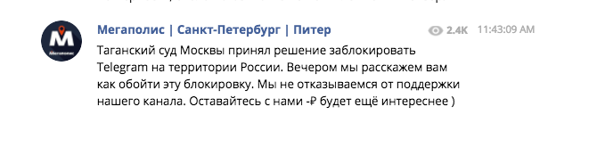 Вообще, конечно, если что не надо запрещать в России, так это телеграм. Ин май хамбл опинион.