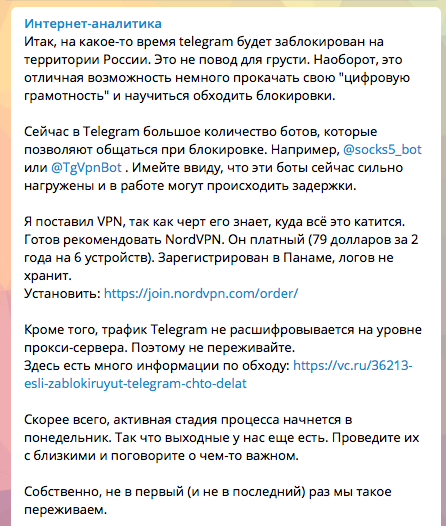 В Telegram-каналах тем временем рассказывают, что делать, когда мессенджер станет недоступен, и как настроить прокси и VPN.