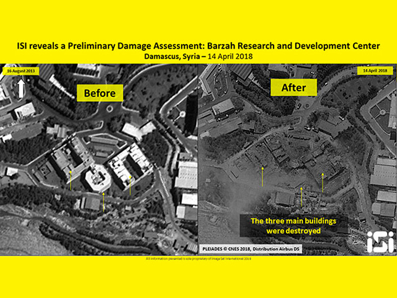 Израильский спутник заснял сирийский научно-исследовательский центр в Барзе до и после ракетного удара союзников во главе с США. В Пентагоне заявили, что в центре разрабатывают химоружие, и он стал одной из трех уничтоженных целей в ходе военной акции в ночь на субботу.