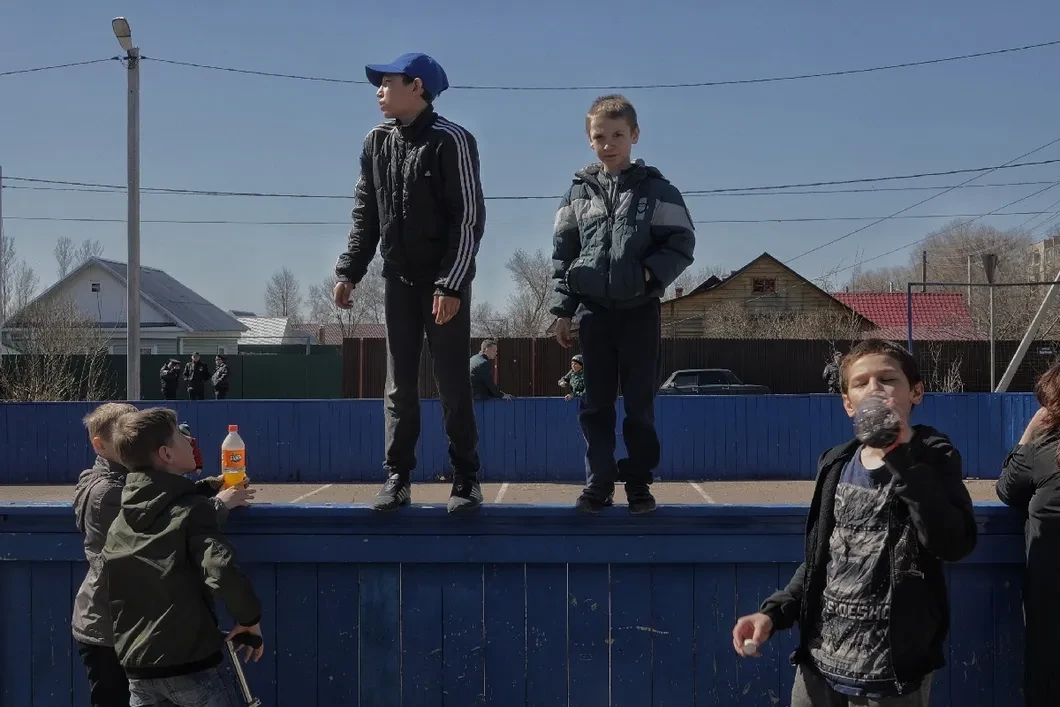 Пацаны на бортике хоккейной коробке, попавшей на территорию митинга. Фото: Влад Докшин / «Новая газета»