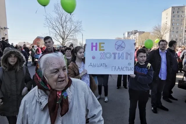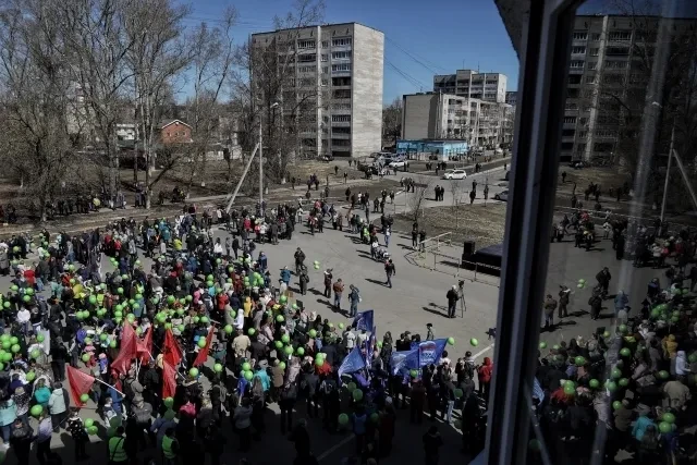 Центральная площадь в поселке Большевик, рядом с которым непосредственно находится полигон, была переполнена. На митинг собралось около пяти тысяч человек. Толпа пестрела флагами, воздушными шарами, плакатами: