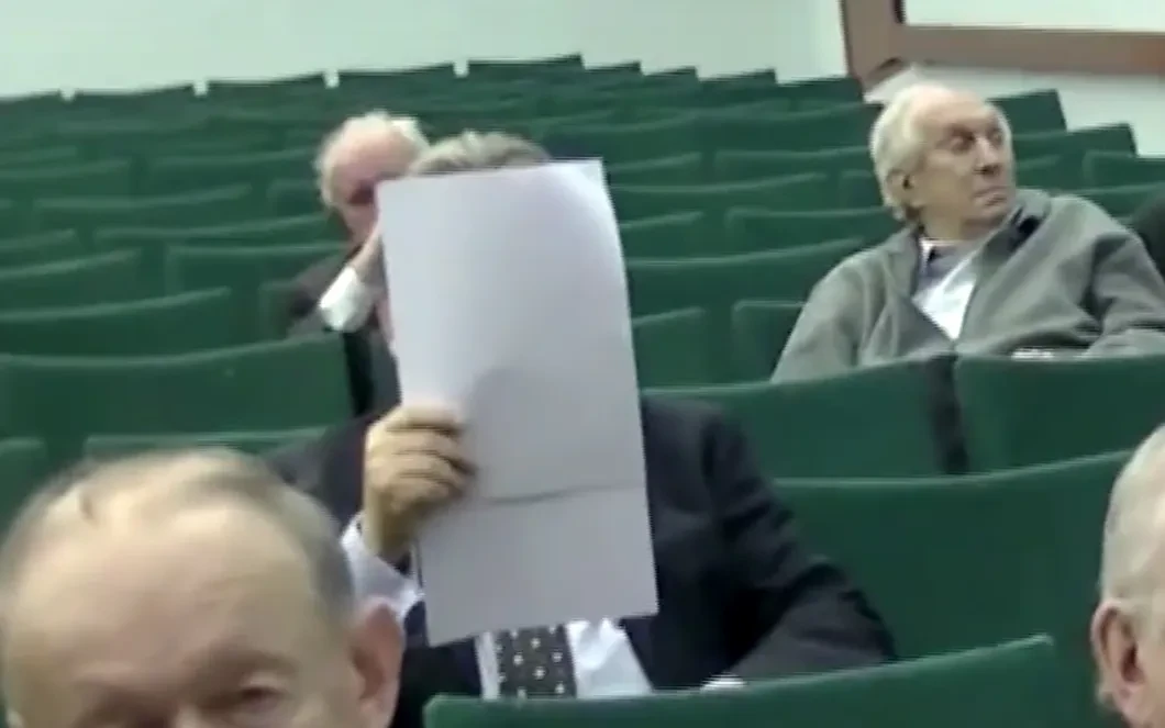 Воробьев вместо обсуждения, что у кого списал Елисеев, достаточно ли убедительно мы это доказали, стал требовать прекратить мою видеозапись, и часть впечатлительных почтенных джентльменов в совете в нарушение регламента поддержала его с мест. Я всячески увещевал совет, что для запрета мне снимать видео им нужно сослаться на нормативно-правовой акт, ограничивающий меня в правах, тогда как п. 18 Положения о диссовете утверждает, что «Диссертационный совет работает в условиях гласности», к тому же само ведение видеозаписи напрямую прописано в Положении. Ректор Елисеев при наведении на него камеры прятался за лист бумаги, а когда я отводил камеру — из-под него вылезал. Этот замечательный эпизод с прячущимся под листом бумаги троедоктором Елисеевым можно видеть на сайте Диссернета.