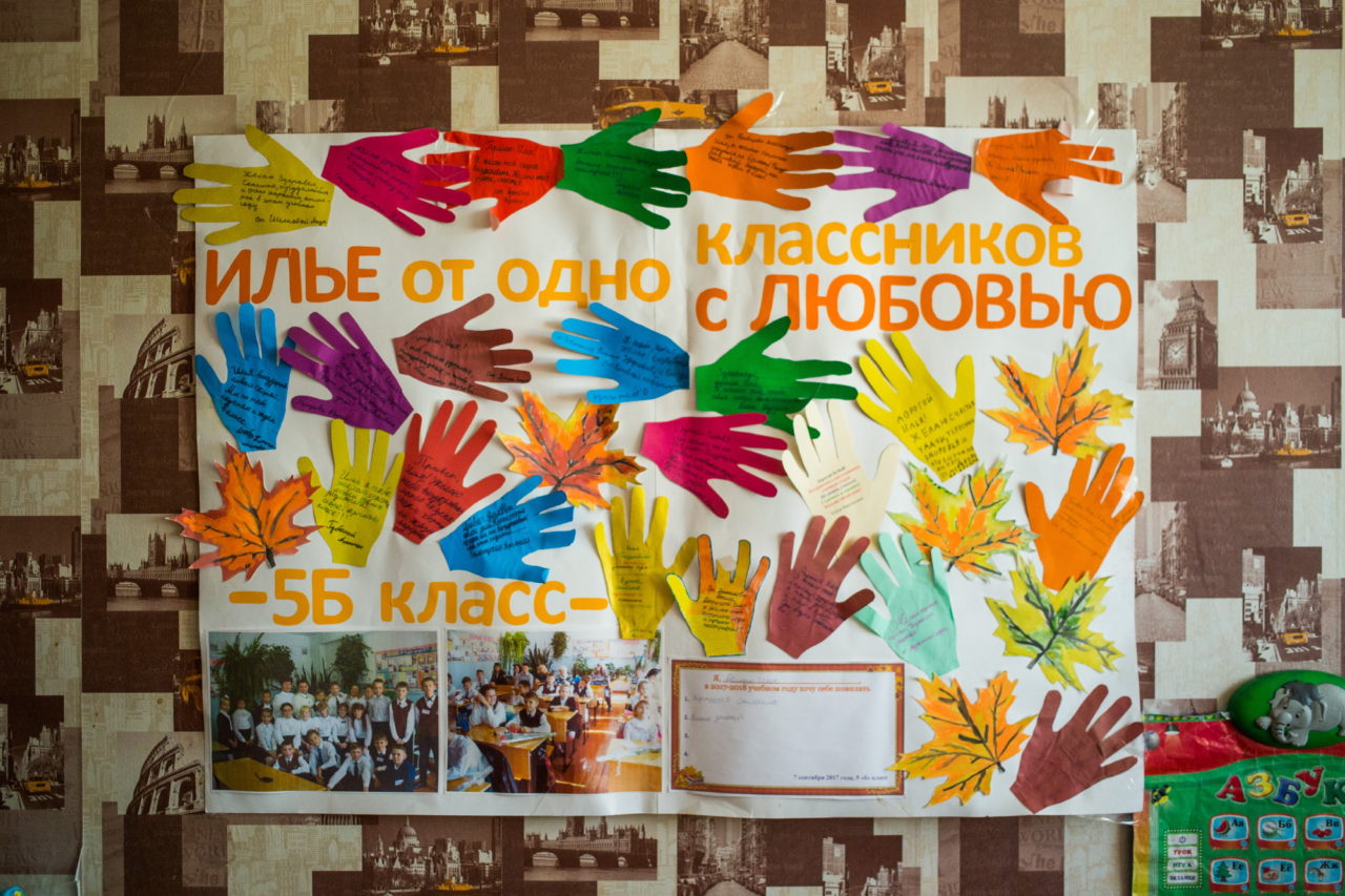 7 сентября, в День осведомленности о миодистрофии Дюшенна, одноклассники Ильи подарили ему плакат с личными пожеланиями от каждогоФото: Антон Климов для ТД Раз в неделю Илья ездит в бассейн. Мальчик занимается квиллингом, обожает «Лего» и мечтает изобретать роботов. Много рисует, но в основном простым карандашом, цвет использует редко. Написал книгу про монстра Драко. «Драко — это имя, — поясняет Илья. — Драко любил лес, а его злейший враг Стрела лес разрушил». Но Драко все же одержал победу над Стрелой. В планах Ильи — вторая часть книги. Может быть, он напишет ее летом, в деревне. Каждый год Алена с мальчишками уезжает в небольшую деревню за 200 километров от города. Илья показывает на фотографиях: «Вот мы жарим хлебушек на костре». Три месяца на свежем воздухе — это курорт. Особенно по сравнению с девятью месяцами дома, шесть из которых — зима.