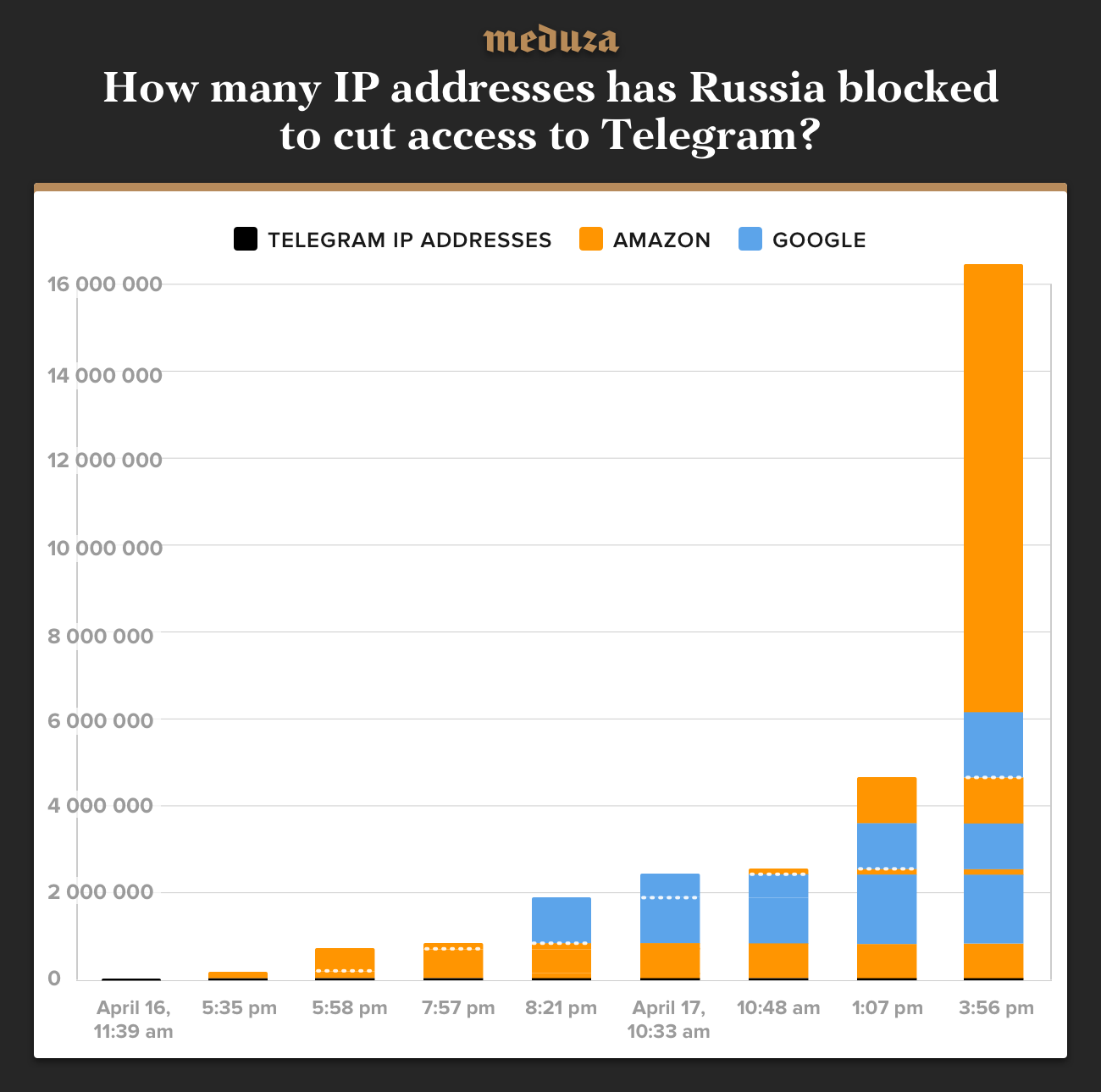 - By blocking millions of IP addresses operated by Google and Amazon, Roskomnadzor has also disrupted access to several Russian businesses and online services. At least 73 entrepreneurs have appealed to the human rights group “Agora” (whose lawyers also represent Telegram against the Russian state), demanding that the Attorney General’s Office review the legality of Roskomnadzor’s actions.