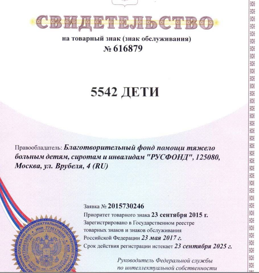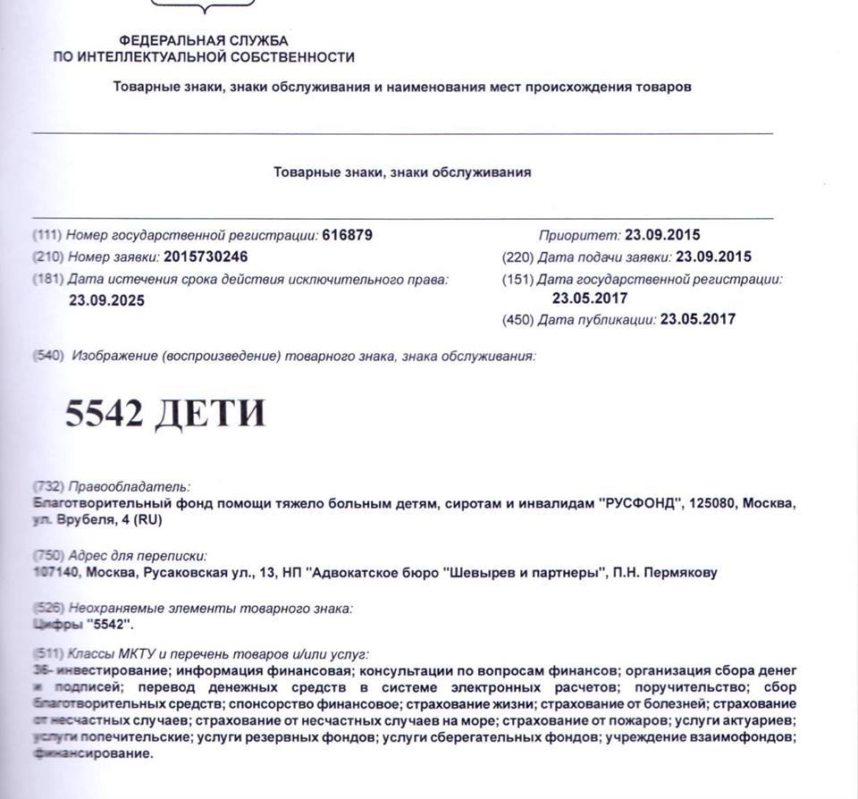 В свидетельстве о регистрации торгового знака указано, что предмет регистрации «5542 ДЕТИ» и «5541 ДОБРО», однако представитель Русфонда заявляет о праве на приоритетное использование слов «дети» и «добро» не только в сочетании с коротким номером, но и на слова сами по себе.