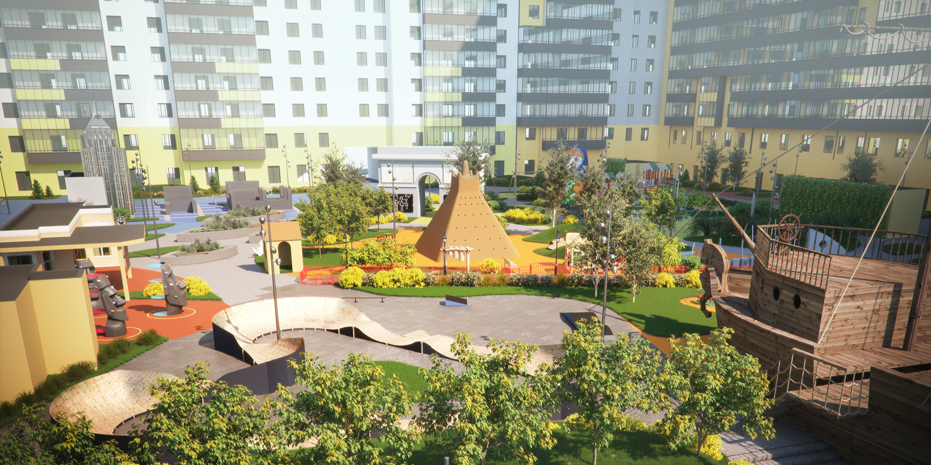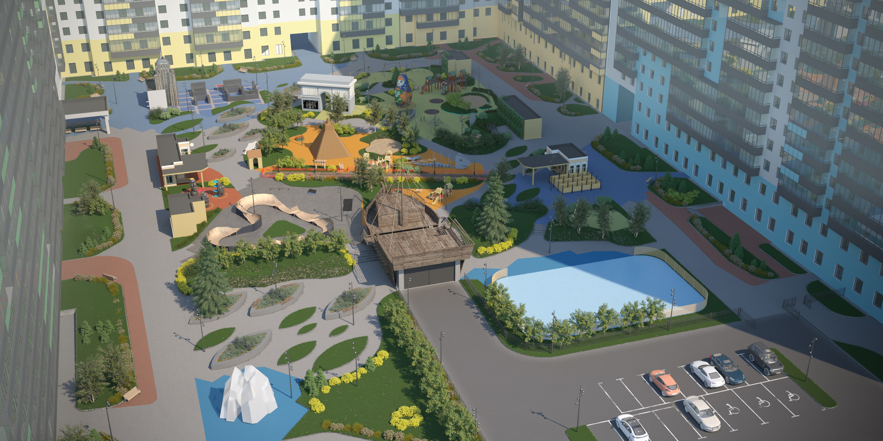 Для детей младшего возраста предусмотрена зона с горками и качелями, для детей постарше — скалодром и скейтпарк. Кроме того, во дворе разместят каток с искусственным льдом, на котором можно будет кататься на коньках в любое время года.