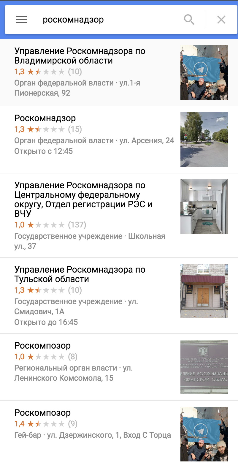 On Google Maps, people have been flooding the entries for Roskomnadzor’s offices across the country with negative reviews, renaming the Moscow headquarters to “Roskompozor” (Roskom-disgrace), changing its listed operating hours to “permanently closed,” and reclassifying it from a “state institution” to a “gay bar” and “psychoneurological dispensary.” Some Internet users have even uploaded photographs to their reviews showing what appears to be groups of terrorists gathered around a flag bearing Telegram's logo, as well as various cat videos and photos of a book titled “What Is Terrorism?”