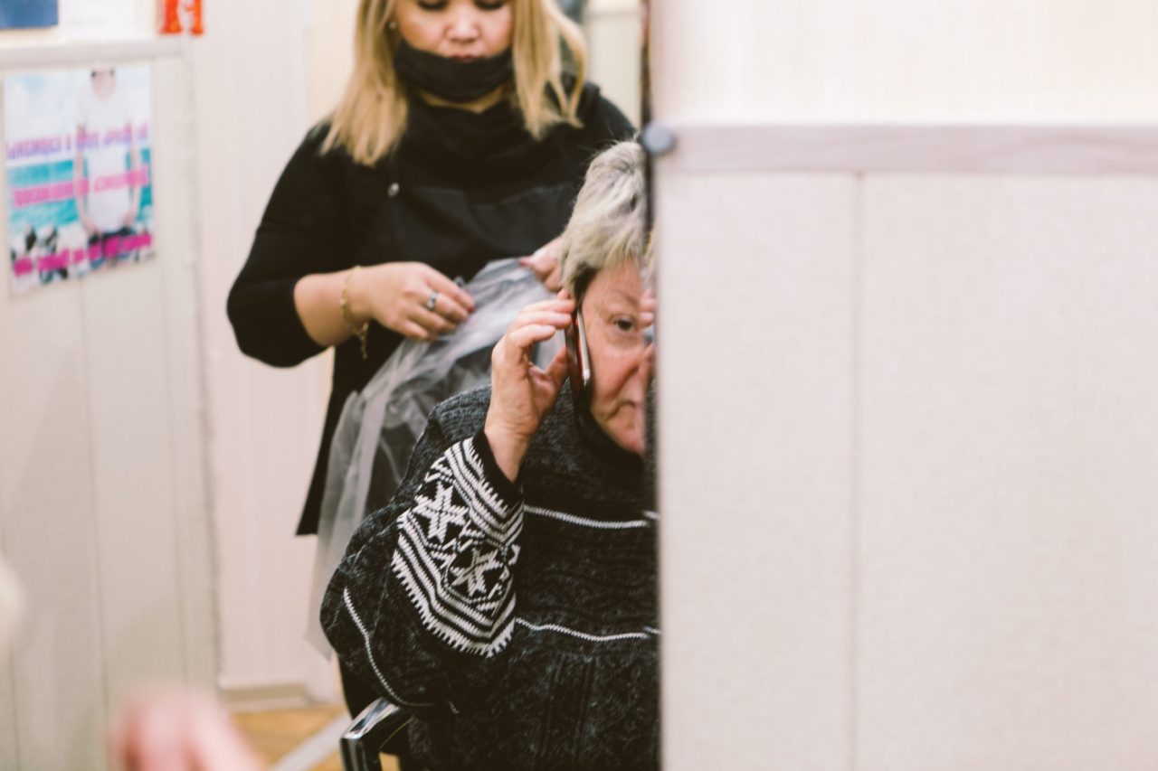 Нина садится в кресло. Ей на голову надевают специальную шапочку для мелирования. Красят. Начинается обычный разговор с девушкой-парикмахером: про снег, жилье, друзей, которые тоже скоро придут стричься.