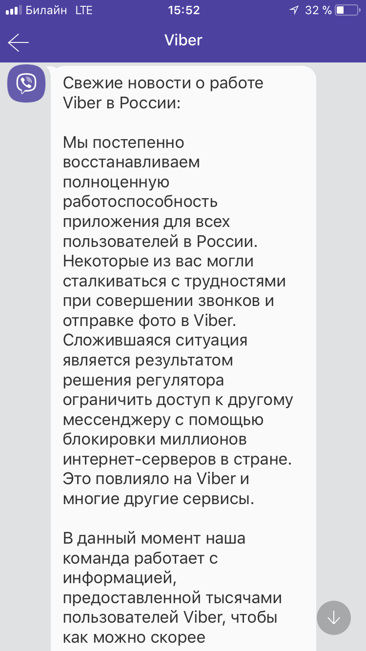 «Некоторые из вас могли сталкиваться с трудностями при совершении звонков и отправке фото в Viber. Сложившаяся ситуация является результатом решения регулятора ограничить доступ к другому мессенджеру с помощью блокировки миллионов интернет-серверов в стране. Это повлияло на Viber и многие другие сервисы», — говорится в сообщении Viber.