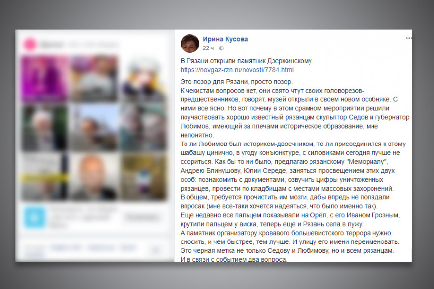«В Германии почему-то не ставят памятников Гиммлеру. А вот в Рязани поставили памятник палачу русского народа Дзержинскому возле нового здания ФСБ. Символично, что памятник Дзержинскому открыли в день рождения Гитлера. Рязанские чекисты своеобразно отметили день варенья фюрера. Такая вот эстафета злодеев... Кадеты с шариками. Знают ли дети, что Дзержинский был кровавым убийцей? Кровавые репрессии были и в Рязани, где чекисты убили тысячи невинных людей. Поэтому печально, что на земле рязанской поставили памятник кровавому палачу русского народа Дзержинскому. Да еще и в день рождения Гитлера».