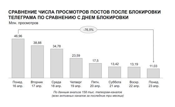 A new report by the monitoring website Medialogia claims that traffic to Telegram’s channels fell by 76.5 percent in the week after Russia started blocking the instant messenger. Medialogia says it counted the number of views on posts by the network’s 158,000 most active channels between April 16 (when Roskomnadzor started blocking Telegram) and April 23, finding that the total fell from almost 47 million to just more than 11 million.