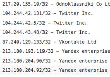 Согласно копии выгрузки для провайдеров, в черный список попали пять IP-адресов "Яндекса", по одному - "ВКонтакте", "Одноклассников", LiveInternet и Yahoo, по три - Facebook и Twitter. На сайте Роскомнадзора все эти адреса значились как заблокированные, уточняет TJournal.