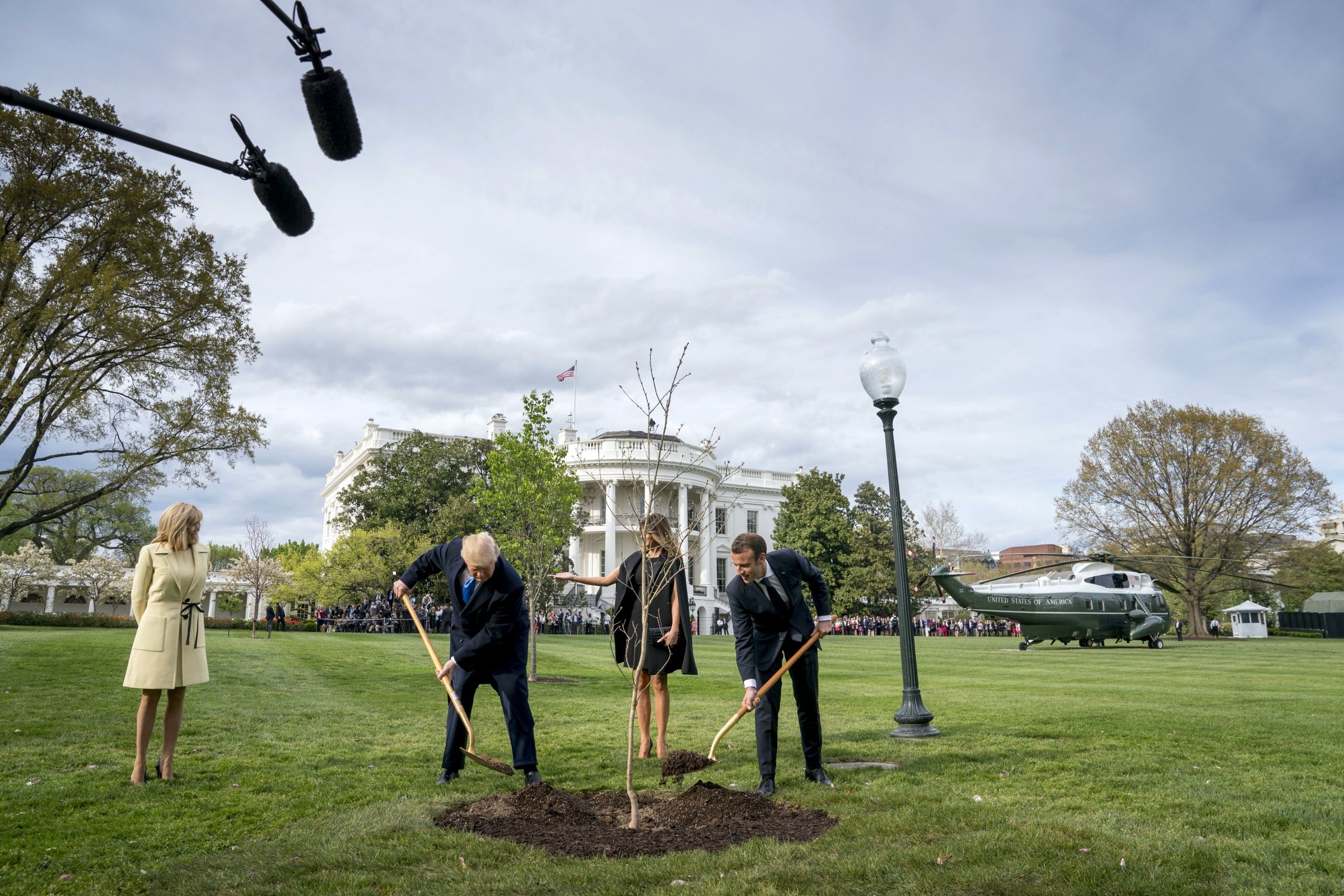 Президенты двух стран посадили саженец около Белого дома. За их работой внимательно наблюдали их жены — Брижит Макрон и Меланья Трамп — и журналисты. Фотографии из официальной хроники тут же разошлись на мемы.