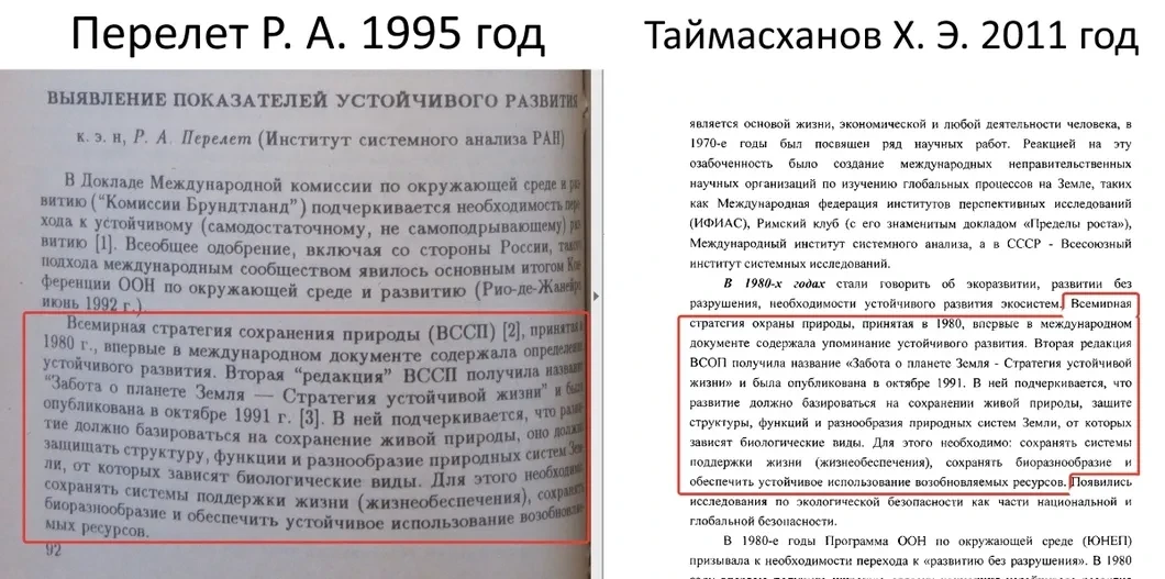 Исходный текст статьи «Википедии» в версии 2005 года подписан именем Рената Перелета — известного ученого, сотрудника Института системного анализа РАН, члена множества международных научно-консультационных групп по экологии, устойчивому развитию, природоохранному законодательству. Я сравнил этот текст с трудами Перелета и убедился, что он в самом деле состоит из текстов, принадлежащих этому ученому, на иллюстрации приведено сравнение фрагмента из работа Р.Перелета 1995 года с фрагментом, который через «Википедию» попал в диссертацию Таймасханова 2011 г.