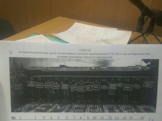 10 суток ареста активист получил якобы за неповиновение сотруднику полиции (ст. 19.3 КоАП), штраф — за нарушение порядка проведения акции (ч. 5 ст. 20.2 КоАП). Кроме того, к его делу приобщили фотографию и список 16 участников акции.
