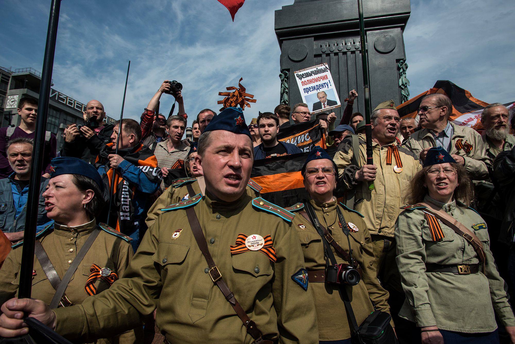 Возле фонтанов на Пушкинской площади, до отказа забитой протестующими, стояли девушки и юноши в картонных коронах — самодельных и из «Бургер кинга». За спиной у Пушкина, однако, находилась сотня людей, явно не разделяющих лозунги акции «Он нам не царь»: тут собрались мужчины в непонятной военной форме и казачьих папахах, на груди у них были георгиевские ленточки.