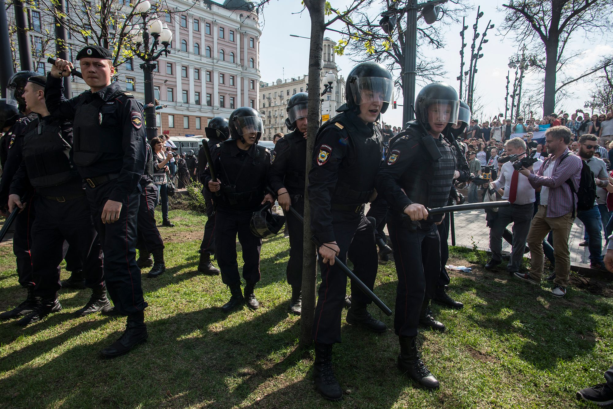 Полицейский буднично объявил в мегафон, что если собравшиеся будут «мешать проходу граждан», к ним «будет применена физическая сила и специальные средства». «О проходе каких граждан вы заботитесь, товарищ?» — обратился к полицейскому молодой человек с плакатом «Путин — не царь. Мы — не рабы». «Ха-ха, я сначала прочитал у тебя на плакате „Мы — не рыбы“, — рассмеялся полицейский и сказал товарищу: — Леха, бери этого». Мужчину с плакатом повели в автозак под крики «Позор!» После этого омоновцы начали задерживать тех, кто скандировал лозунги или держал в руках плакаты.