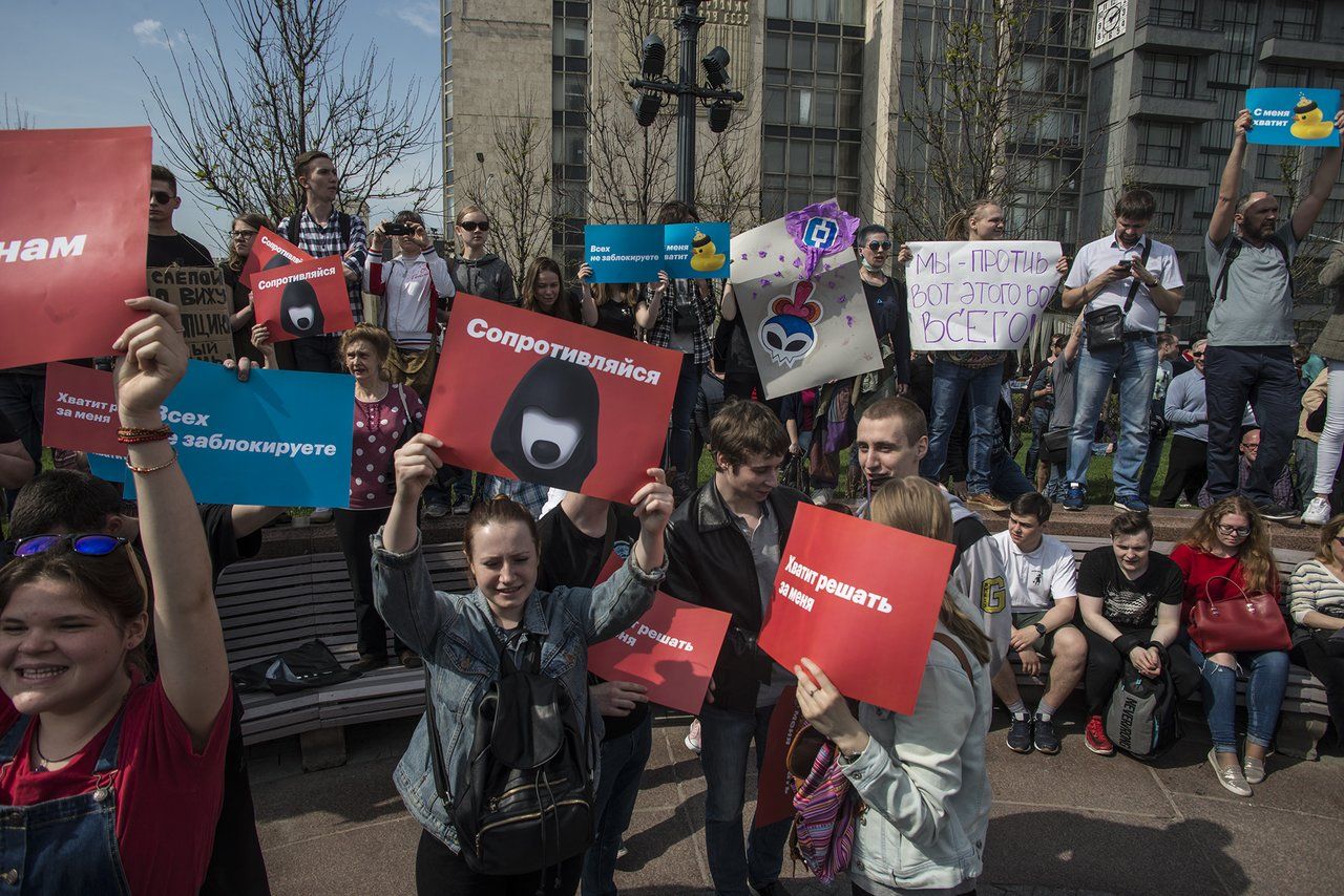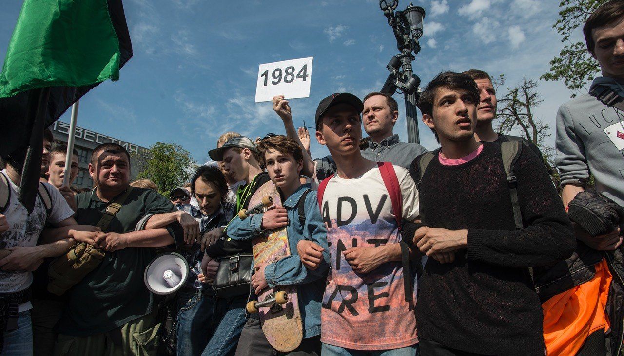 In what’s become a tradition at Russian protests, two young men climbed a street lamp and started shouting, “We won’t be slaves!” Before long, a group of riot police officers walked up, and one of them said, “Come on down, boys, or you might slip.” When they didn’t budge and instead began chanting, “We want to live in a free country!” the officers started shaking the lamppost. One of the boys tried to climb higher, but he fell. Lucky for him, his friends below caught him. The other young man climbed down on his own.