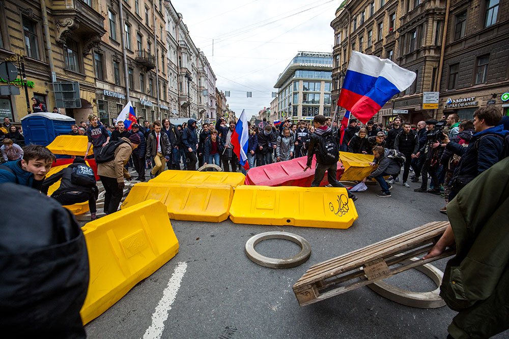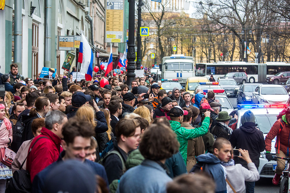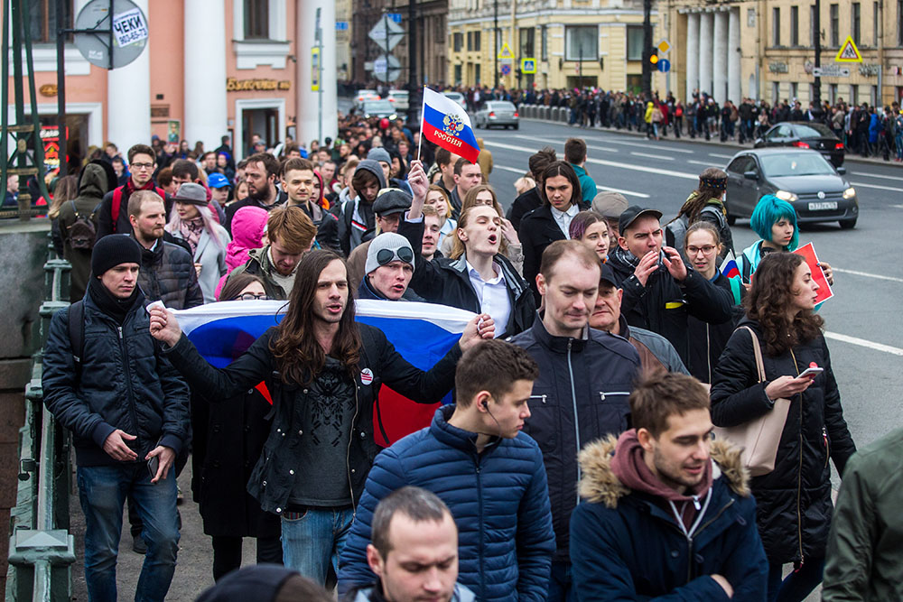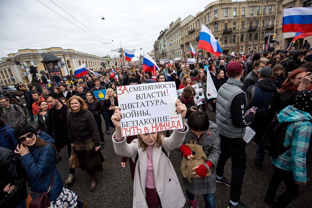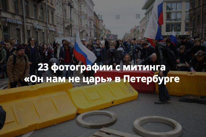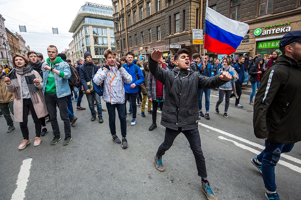 Шествие по Невскому, столкновение с ОМОНом и задержания у Исаакия: 23 фотографии с митинга «Он нам не царь» в Петербурге