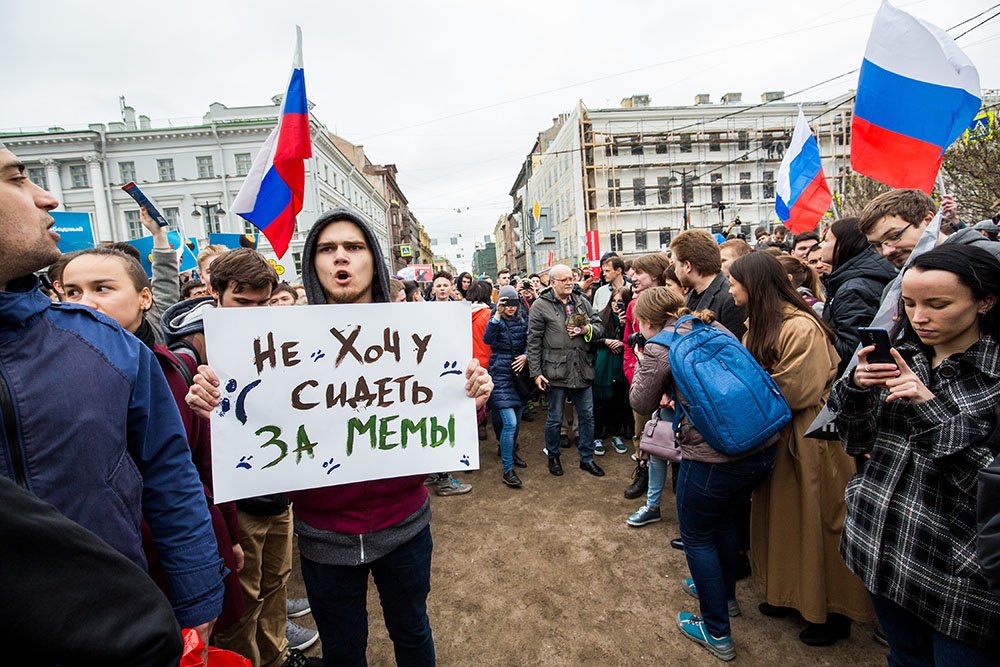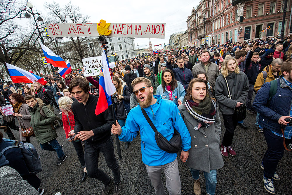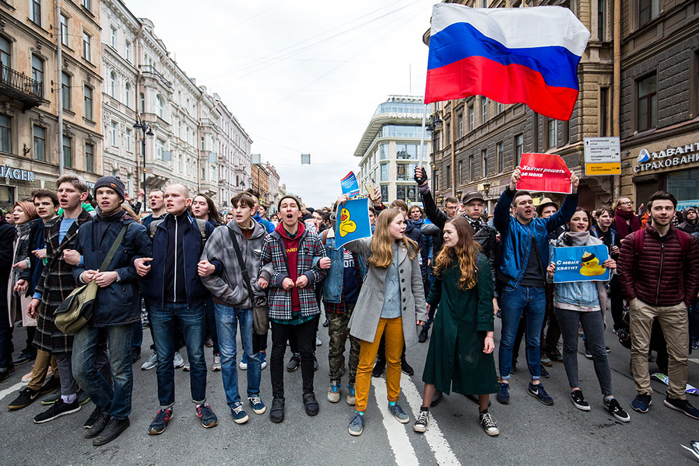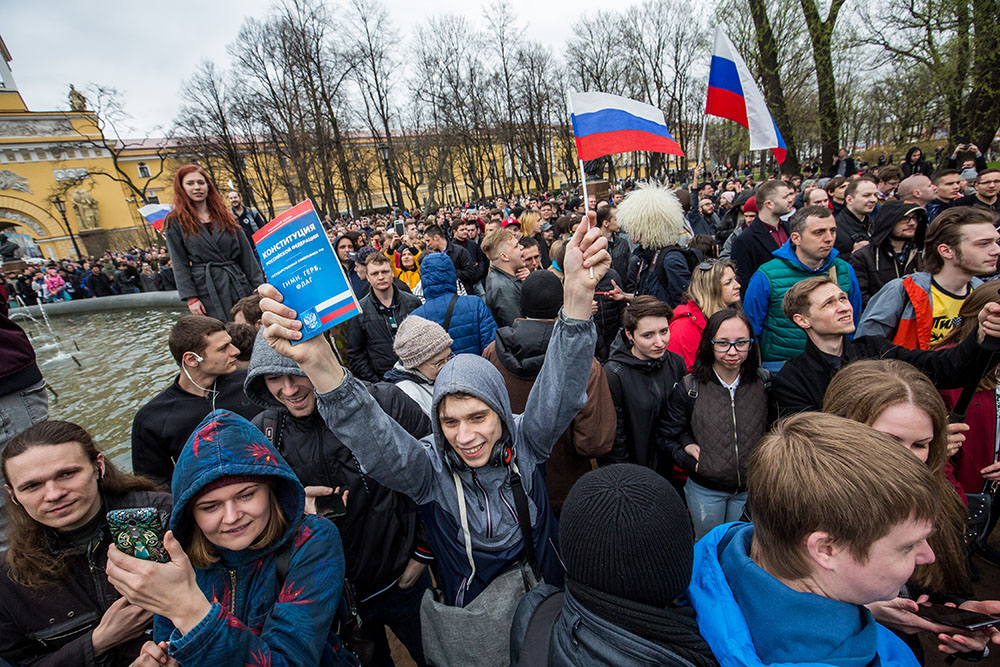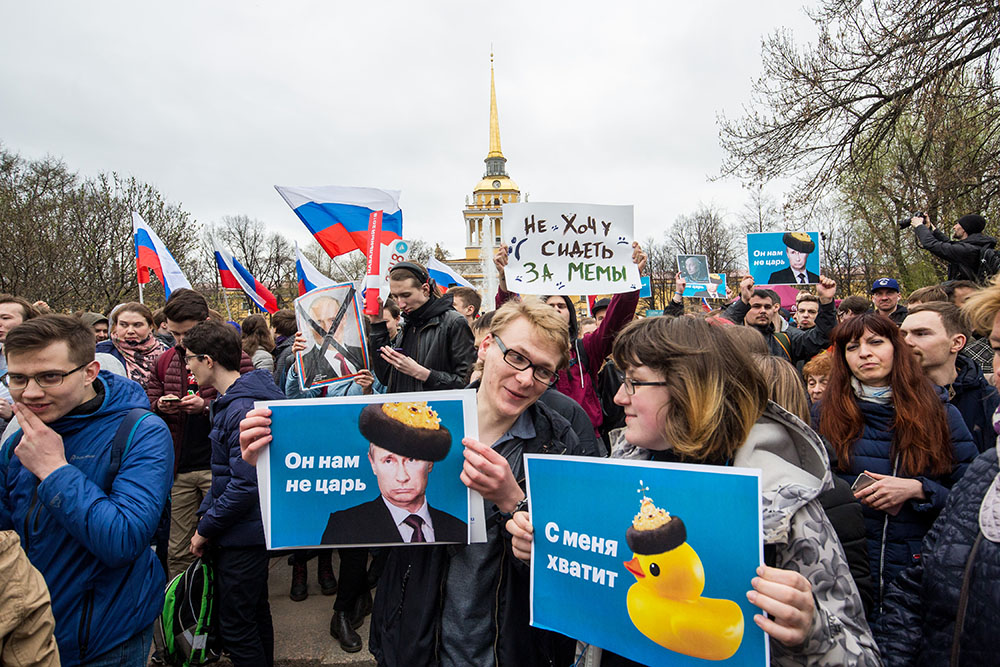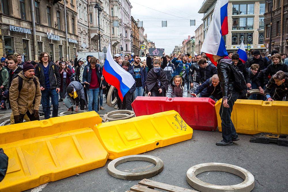 Шествие по Невскому, столкновение с ОМОНом и задержания у Исаакия: 23 фотографии с митинга «Он нам не царь» в Петербурге