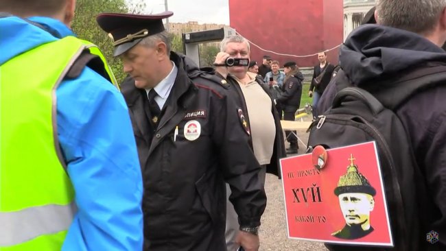 На рюкзаке у мужчины был прикреплен плакат с изображением Владимира Путина и надписью «ну просто ХVЙ какой то». Несколько сотрудников полиции повели его к автозаку.