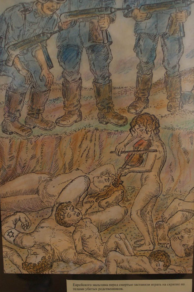 «Еврейского мальчика заставили играть на скрипке на телах убитых родственников», картина на выставке Льва ТыринаФото: Александр Гривин для ТД В этом году из рисунков Тырина сделали выставку к 75-летию победы в Сталинградской битве. 75 работ висят на третьем этаже волгоградского ТЮЗа. Лев Сергеевич собирается еще ее дополнить. Переживает, что может не дожить до 80-й годовщины победы в битве. Хотя рисовать будет непросто. Художник практически ослеп на один глаз и работает в бинокулярных очках.