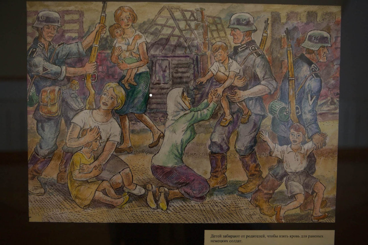 «Детей забирают от родителей, чтобы взять кровь для раненых немецких солдат», картина на выставке Льва ТыринаФото: Александр Гривин для ТД Мальчики вышли на дорогу, которая вела в Сталинград. Вдоль нее на деревьях и столбах висели солдаты и мирные жители. До дома ребята добирались еще несколько дней. Ночевать приходилось и в танке, и в подвале разрушенного дома, в бункере, в котором поселились подростки, оставшиеся без родителей. Под конец Левка совсем обессилел. Он промочил ноги и сильно замерз, идти совсем не мог. Юрке пришлось тащить его по снегу за концы шарфа.