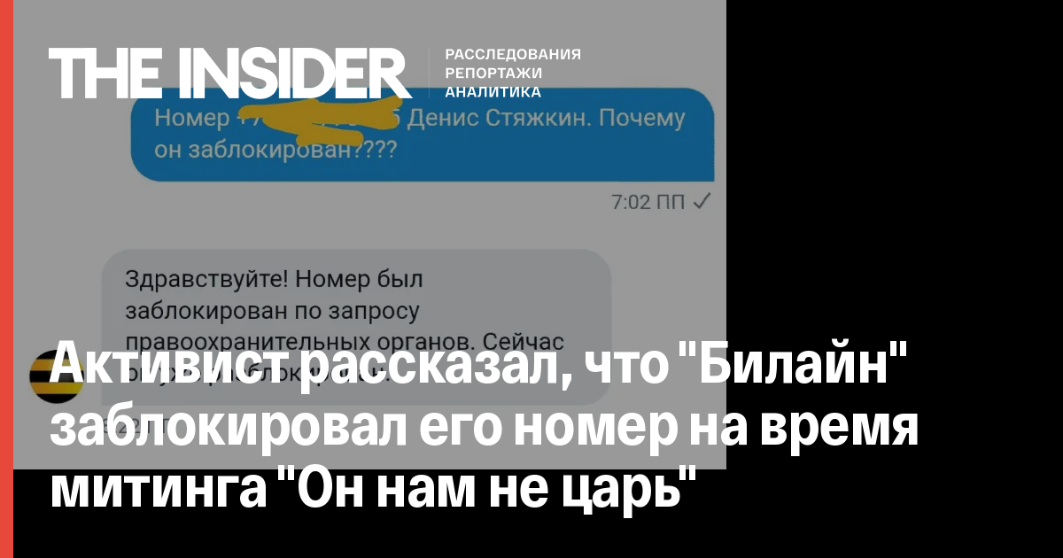 Активист Денис Стяжкин рассказал, что «Билайн» заблокировал его номер на время участив в оппозиционном митинге «Он нам не царь» на Пушкинской площади в Москве. На вопрос о причине блокировки, оператор ответил, что это было сделано по запросу правоохранительных органов.