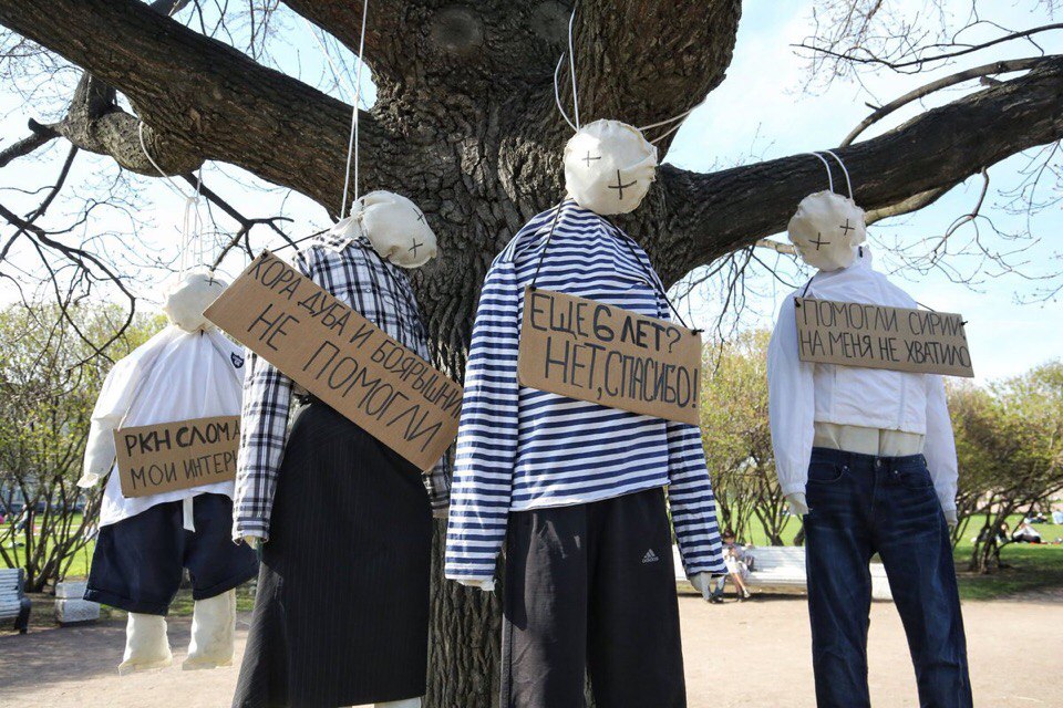 Три активиста петербургского движения “Весна” – Николай Петросян, Тимур Расулов и Олег Усов пришли на Марсово поле и развесили на дереве 4 большие куклы, изображающие людей. На шее у каждого повешенного активисты закрепили таблички: “Еще шесть лет? Нет, спасибо!”, “Кора дуба и боярышник не помогли”, “РКН сломал мой интернет” и “Помогли Сирии, на меня не хватило”. Пресс-секретарь “Весны” Антон Горбацевич поясняет, что это отнюдь не призыв к суициду, а просто активисты считают, что Путин – не их президент, и поэтому отмечают его инаугурацию грустным перформансом.