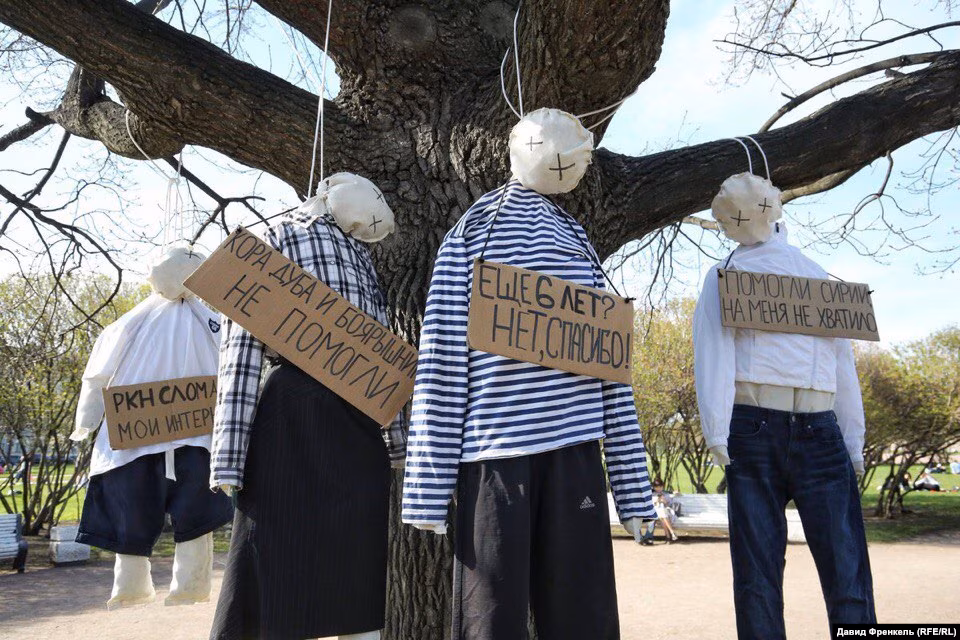 На Марсовом поле в Санкт-Петербурге 7 мая трое активистов движения "Весна" повесили на дерево четыре куклы. На шее у них висели таблички с надписями: "Еще шесть лет? Нет, спасибо!", "Кора дуба и боярышник не помогли", "РКН сломал мой интернет" и "Помогли Сирии, на меня не хватило". Акция была приурочена к инаугурации президента России Владимира Путина. Перформанс прервали сотрудники полиции, которые задержали активистов.