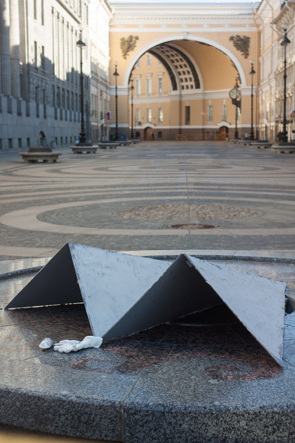 Петербургский художник Hioshi установил у Эрмитажа инсталляцию «Бумага кроет камень». Бумага — это самолетик из логотипа Telegram, а камень — рука с топориком, на котором нарисован знак Роскомнадзора.