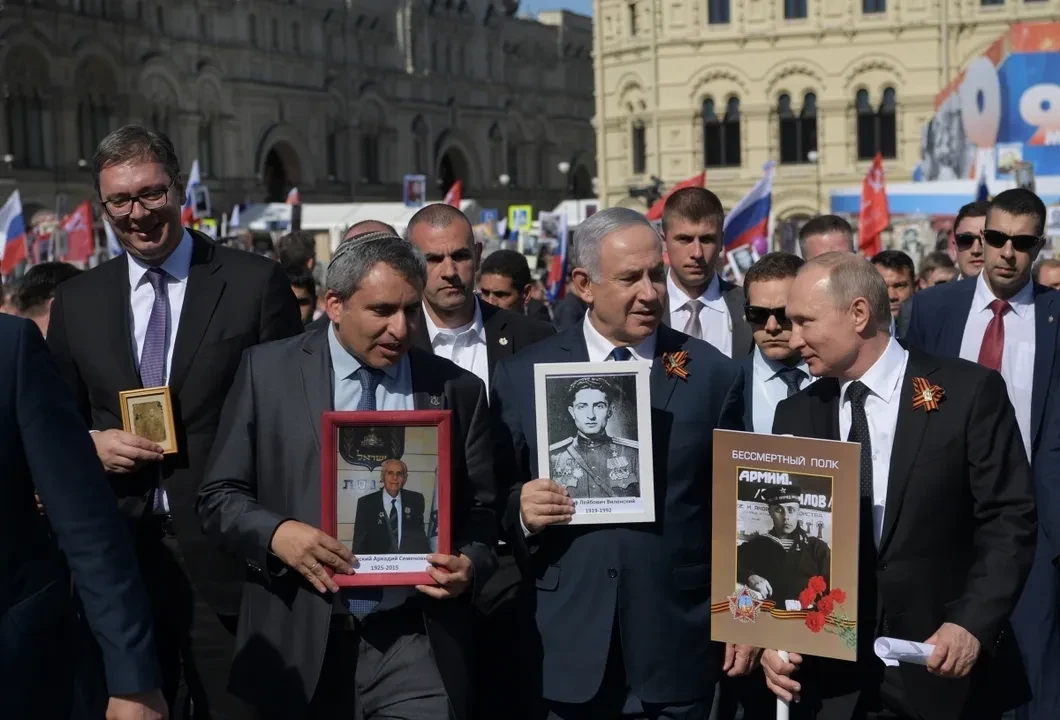 Нетаньяху был на трибуне вместе с Путиным во время парада, а потом также вышел на марш «Бессмертного полка». Российский лидер традиционно нес портрет своего отца Владимира Путина, а израильский — литовского еврея и боевого комбата Красной Армии Вольфа Виленского, который близким родичем Нетаньяху не приходится, но зато Герой Советского Союза. После войны Виленский остался служить, окончил академию Фрунзе, командовал полком и дивизией, но выше полковника не поднялся из-за госполитики антисемитизма в СССР. В 1972 году Виленский окончательно ушел в отставку и подал документы на выезд в Израиль, куда прибыл в 1983 году после 11 тяжких лет пребывания в советском отказе. Умер в 1992 году в Израиле, где для евреев он — герой, в СССР, понятно, его из героев вычеркнули, но потом в РФ обратно вписали.