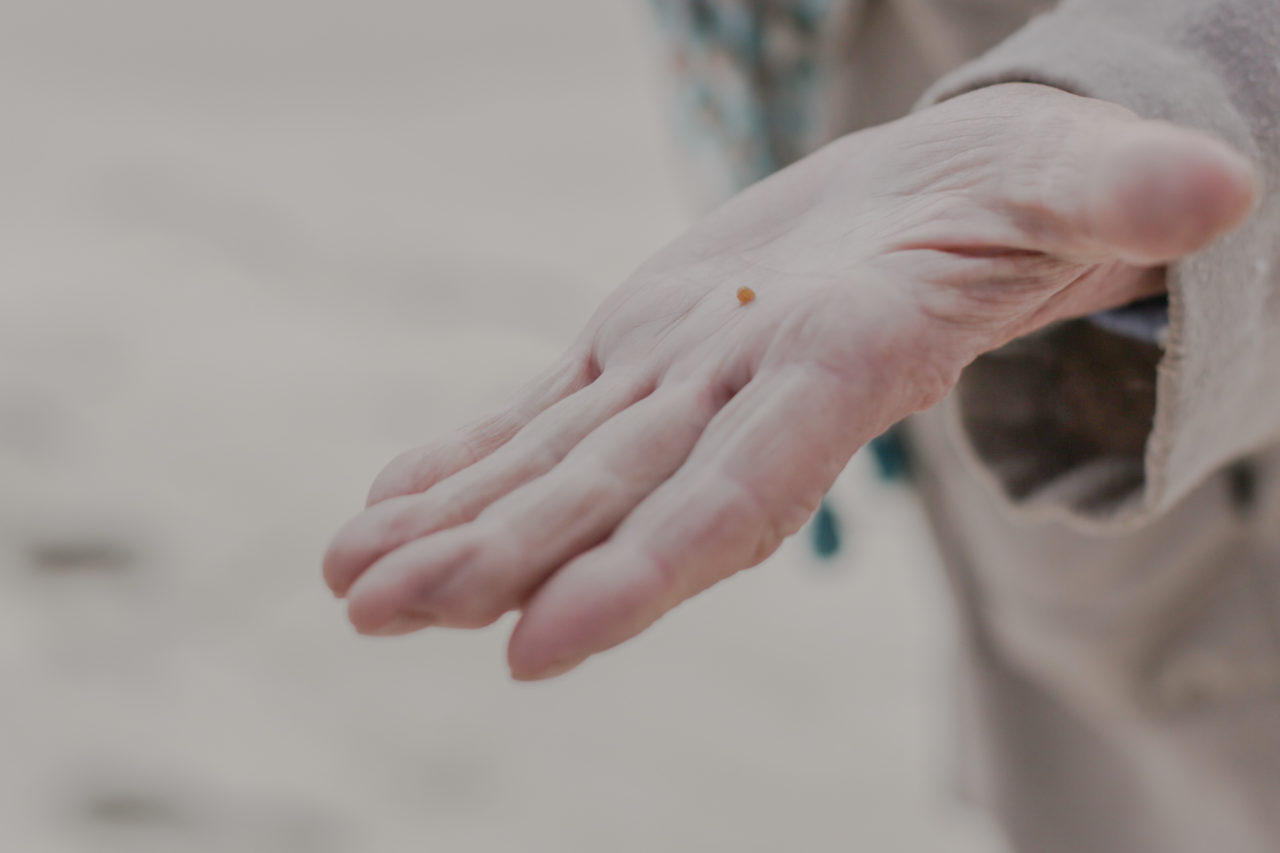 Напоследок мы заходим в Нине Васильевне на чай. Она зарывается в сервант и достает маленькую керамическую мисочку. «Сейчас покажу вам камушки, кое-что у меня осталось». Высыпает на диван содержимое: несколько янтарных замочков и горстка бусин: каленые (рыжие), естественные (белые) — всего штук шесть.