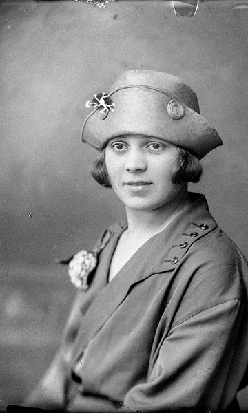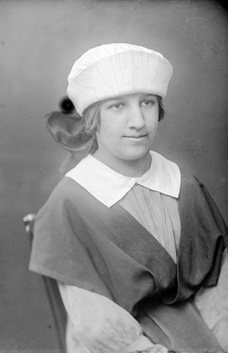 Учащаяся среднего учебного заведения, начало 1920-х годов. Девушка одета в свежее серое платьице, гимназический передник, белоснежный воротничок с шляпкой, обтянутой драгоценным муаровым шелком, тоже белым. Скорее всего, живет в зажиточной семье.